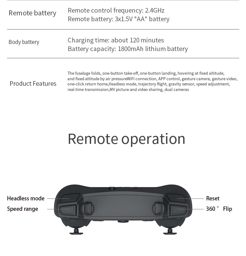 The control range of 2.4GHz transmitter reaches to 3000 feet high range; battery level and GPS signal shown on the LED screen; right hand throttle mode is available for left-hander. Remember to remove the scratch-proof film from the controller and the camera before use.