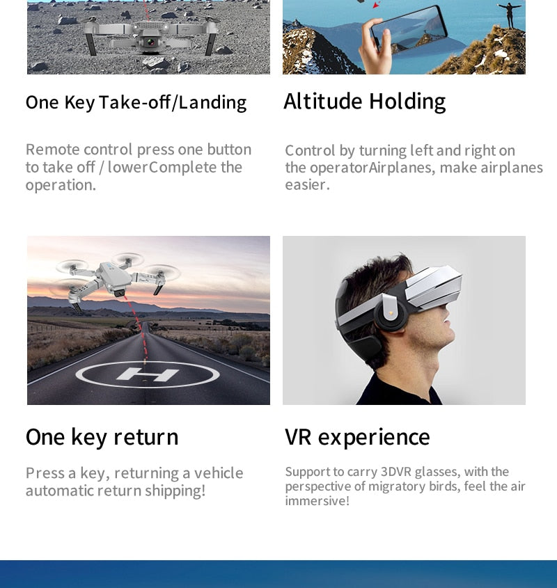 Equipped Multi Sensors guarantee hovering with great stability and high quality pics taken under different flying environment; Optical Flow Positioning makes great effect when GPS signal is lost or weak. Functions, like one key start/stop, emergency stop, altitude hold and electric fence, keep it simple to control for even beginners.
