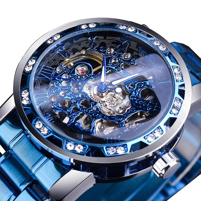 Transparent Diamond Mechanical Blue Stainless Steel Skeleton Watch