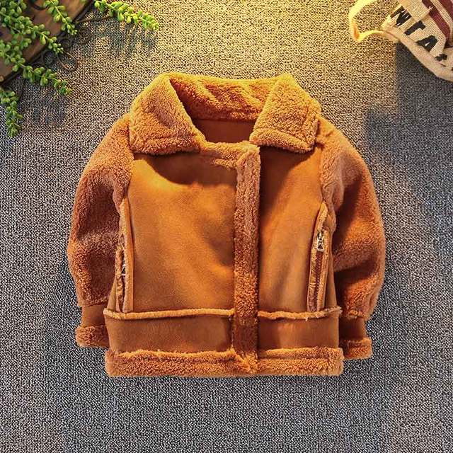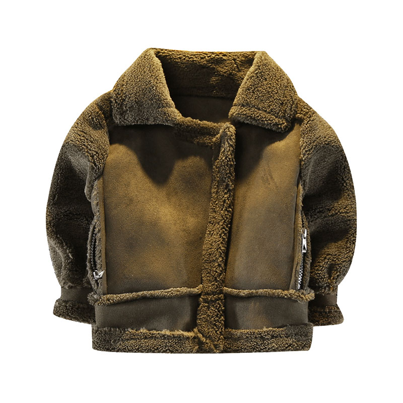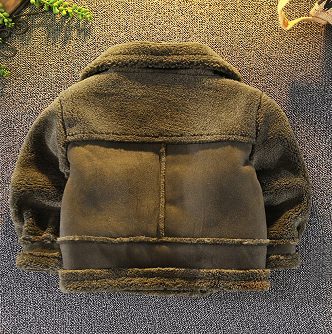 Windproof unisex children's coat made out of wool, polyester and corduroy fabric material. England style patchwork pattern type. The coat is turn down collared and button down. Will keep your child warm and stylish in winter.
